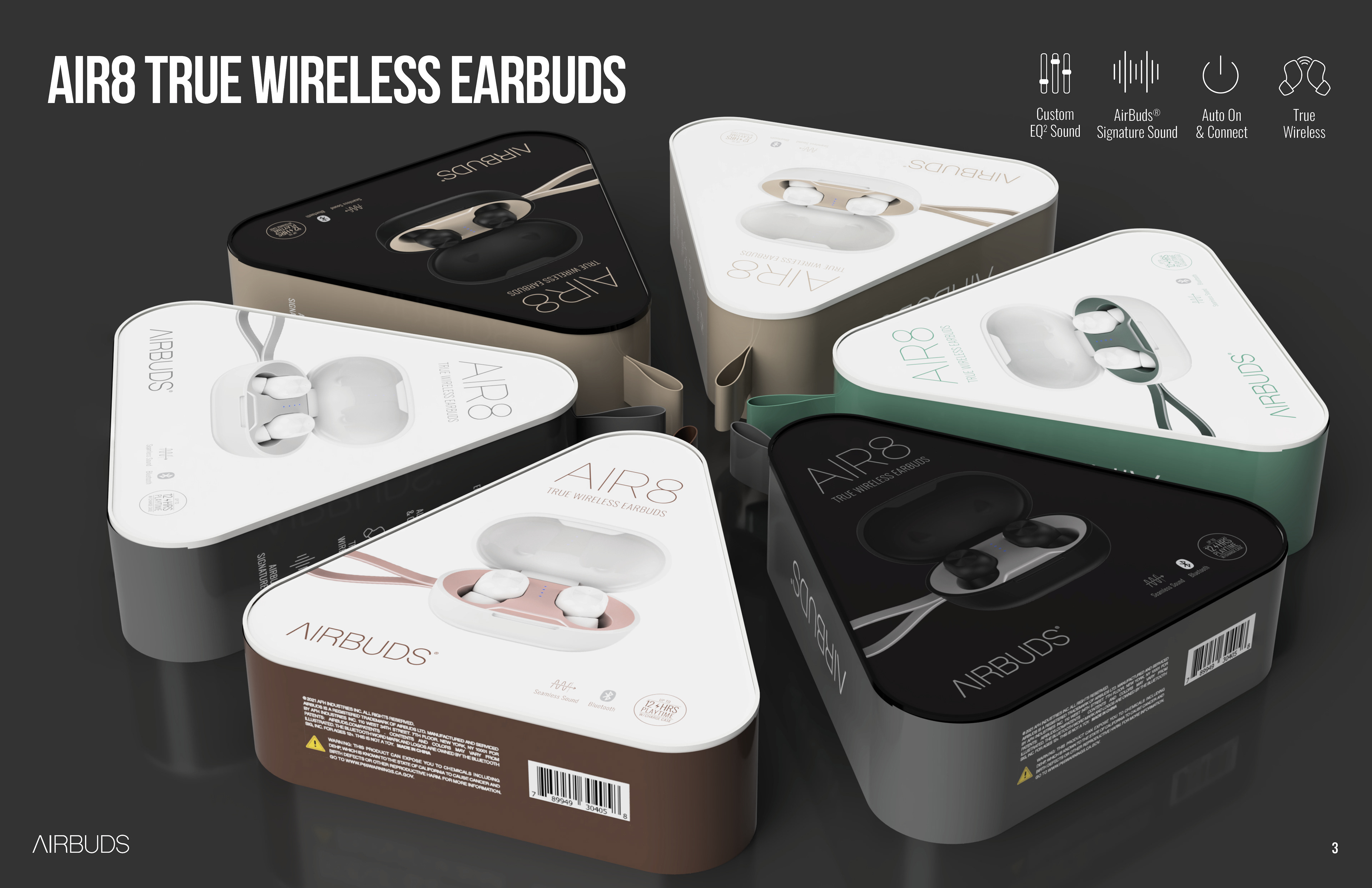 AFH Industries private label design. Industrial Packaging design for AIRBUDS AIR 8 Product launch. Innovative structural packaging design for a modern Bluetooth headphone brand.