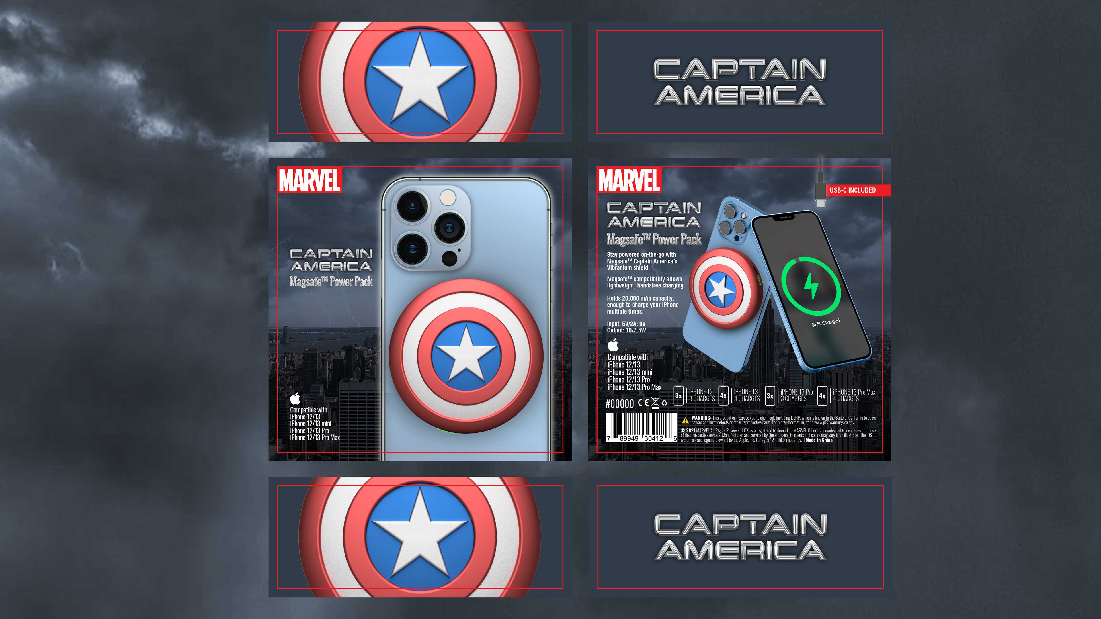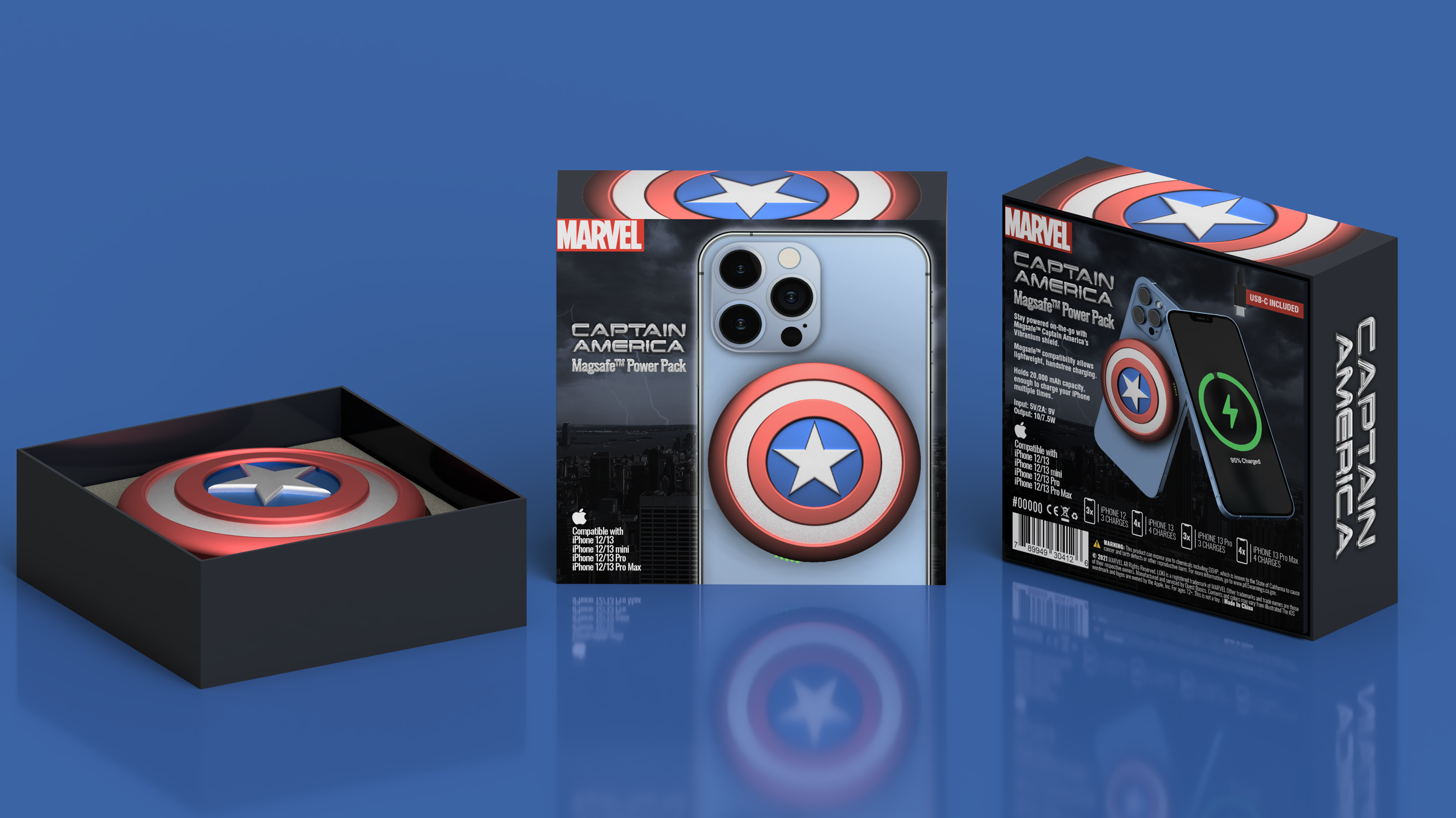 Industrial & Packaging design for a Marvel licensed consumer electronic product. iPhone Magsafe compatible wireless battery pack with Marvel Captain America branding.